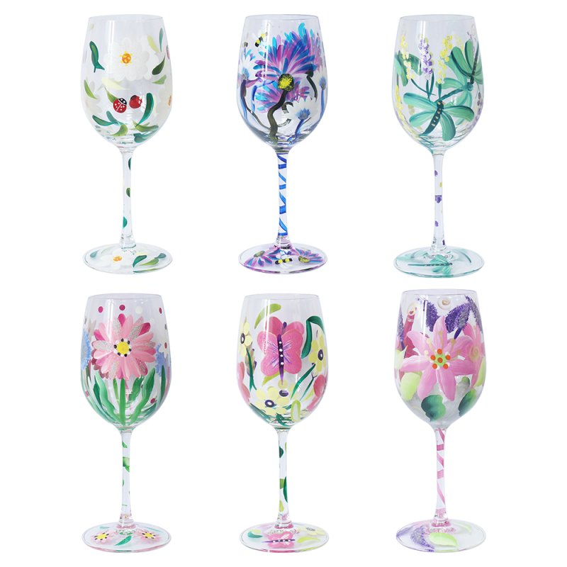 HAND PAINTED WINE GLASS 6 ASST